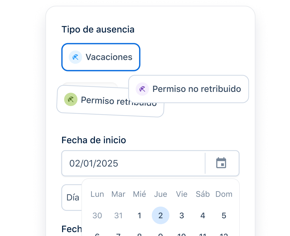 La gestión de permisos automatizada abarca desde vacaciones anuales hasta permisos por matrimonio, mudanza o asuntos propios, aplicando automáticamente las políticas de empresa y convenios colectivos.