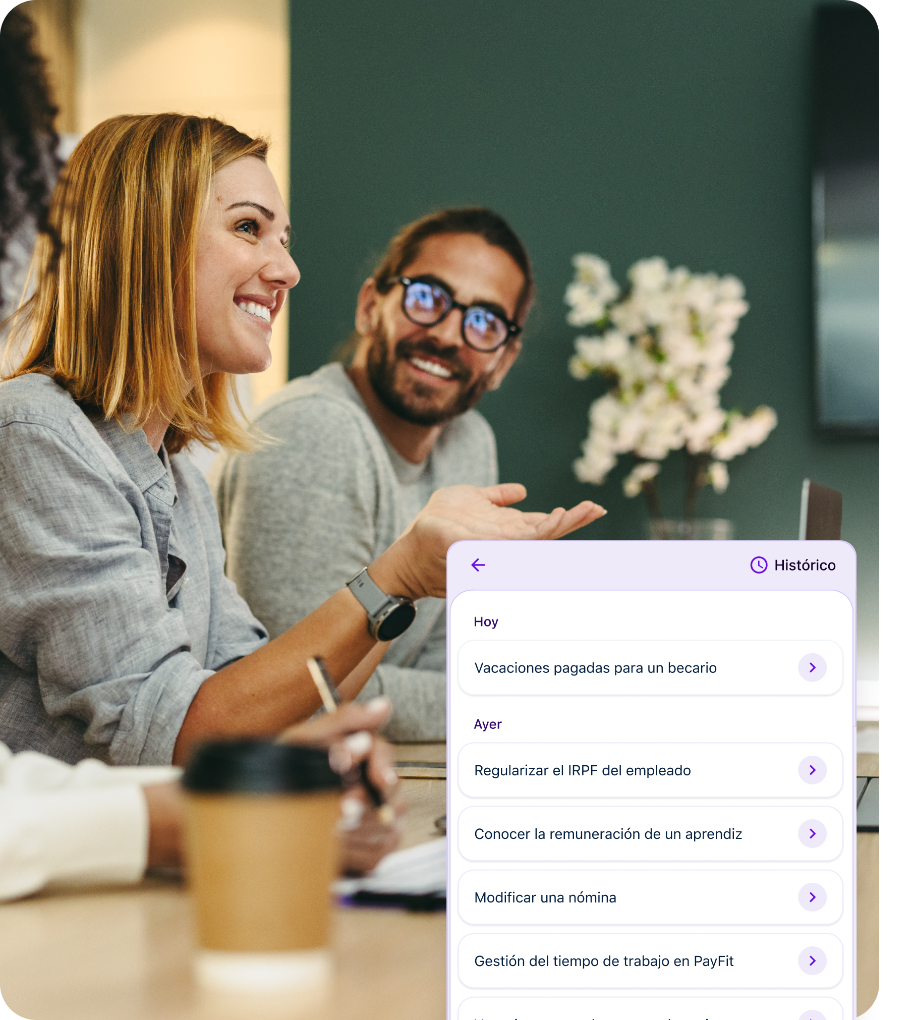 Directamente desde tu espacio PayFit. Sin instalaciones ni configuraciones: inicia sesión y empieza a conversar. Disponible 24/7.